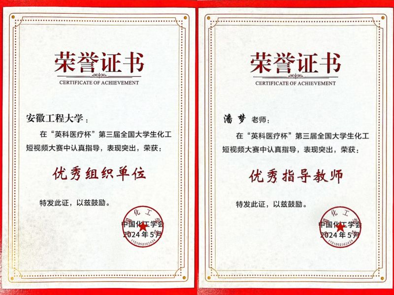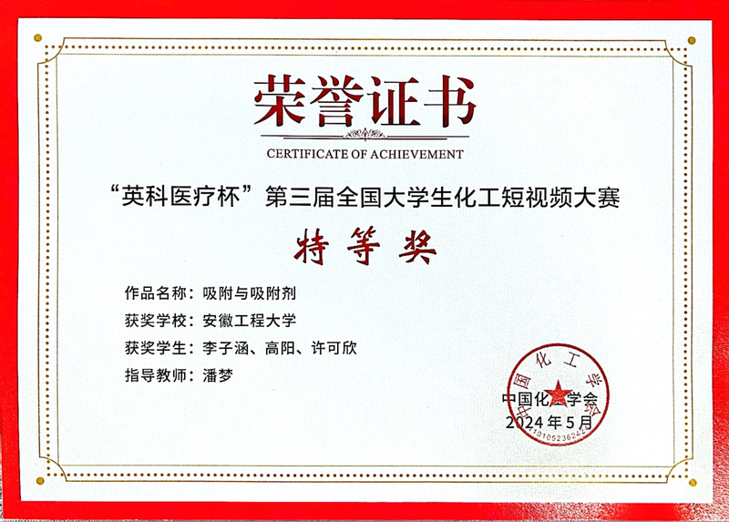 近日,由中国化工学会主办、合肥工业大学承办的第三届全国大学生化工短视频大赛圆满落幕。我校9999js金沙老品牌学子表现突出,李子涵、高阳、许可欣三位同学创作的短视频作品《吸附与吸附剂》荣获特等奖。同时,我校荣获优秀组织单位,潘梦老师荣获优秀指导教师。